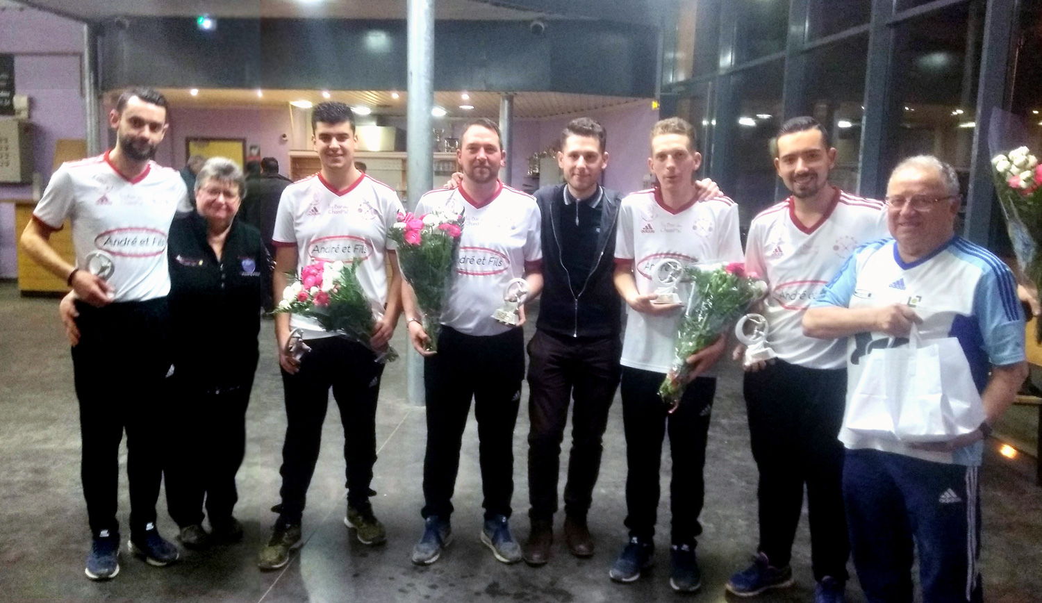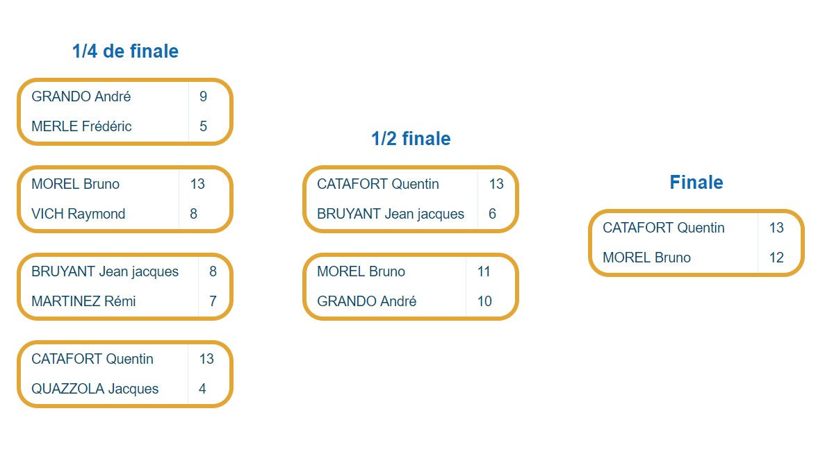 Le 1/4 de finale du dimanche matin fut bien négocié lors d’une partie spectaculaire face à l’équipe QUAZZOLA Jacques. Nos joueurs s’imposeront ensuite face à BRUYANT Jean-Jacques en demi-finale au terme d’une très belle partie là encore, avant de remporter la finale face à l’équipe MOREL Bruno; une finale âprement disputée et pleine de rebondissements gagnée sur le score de 13 à 12 !